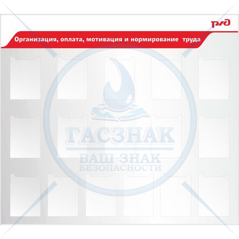 Стенд. Стенд Уголок по охране труда ( 4 кармана формата А4, плоских, 2 кармана формата А4, объемных) стиль РЖД с логотипом, Логотип (1000х1000; Пластик ПВХ 4 мм, алюминиевый профиль; )