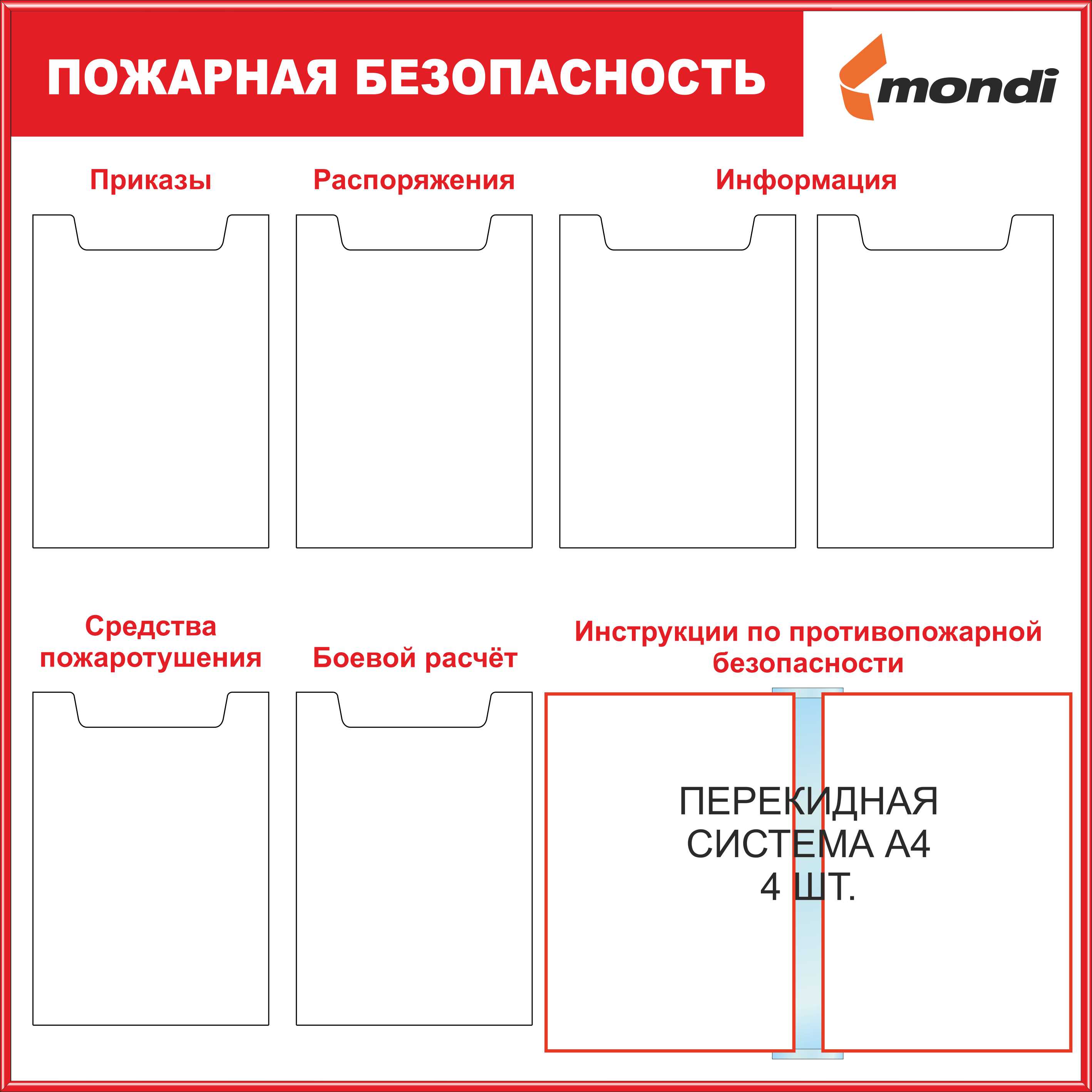 Стенд Пожарная безопасность, карман А4 плоский-5шт, карман А4 объемный - 2шт,перекидная система А4 на 10 рамок (1400х1200; Пластик ПВХ 4 мм, алюминиевый профиль; Алюминиевый профиль)