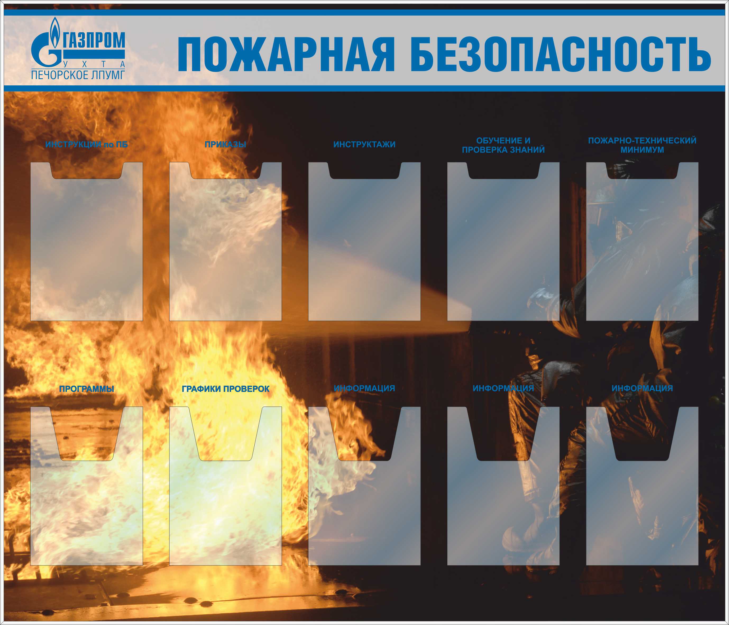 Стенд Пожарная безопасность. Перекидная система А2х5шт., Логотип (1100х850; Пластик ПВХ 4 мм, пластиковый профиль; Пластиковый)